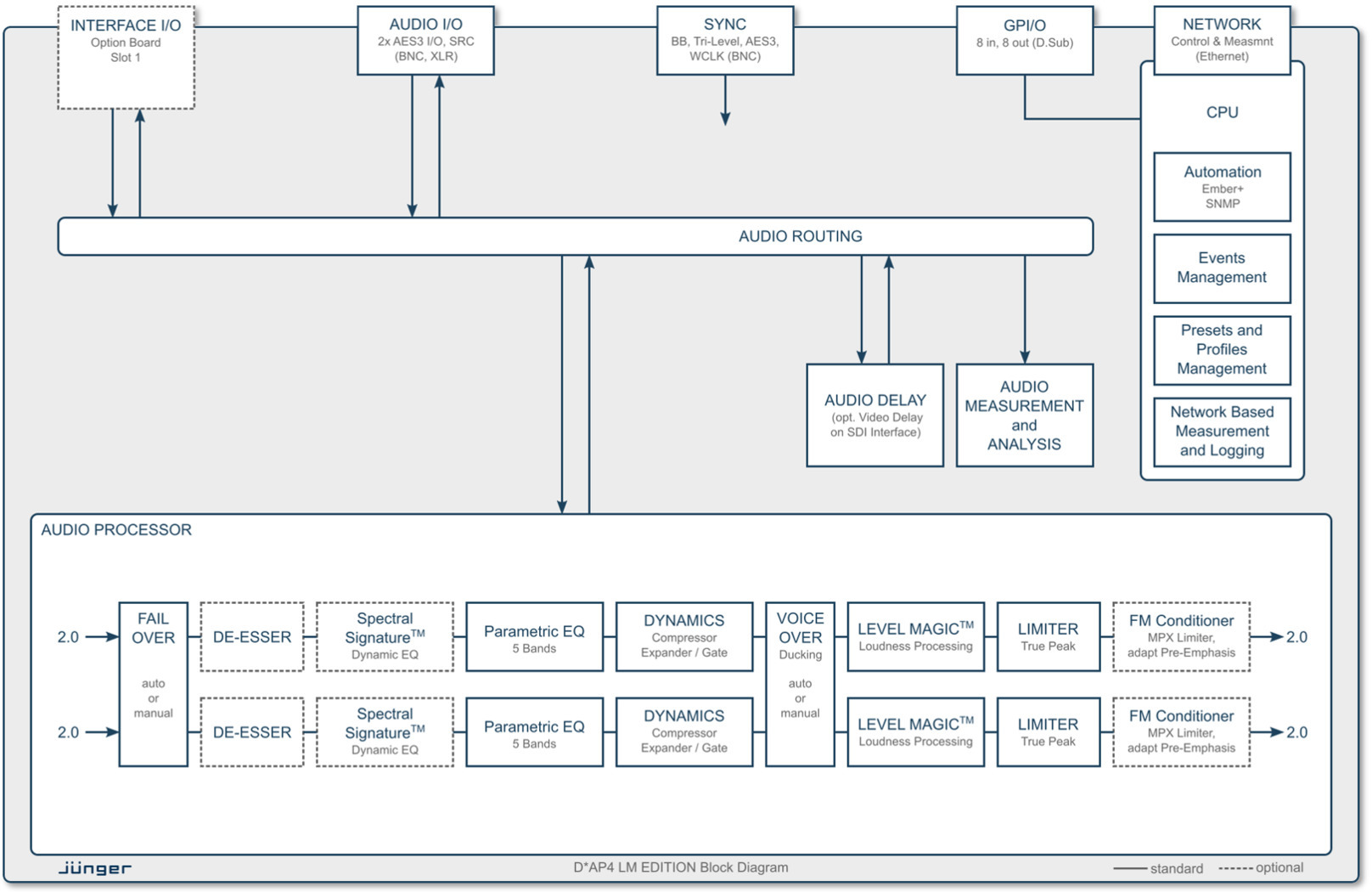 • • Level Magic loudness management (optional) according to: ITU-R BS.1770 (all revisions), EBU R128, ATSC A/85, ARIB TR-B32, Free TV OP-59 and Portaria 354