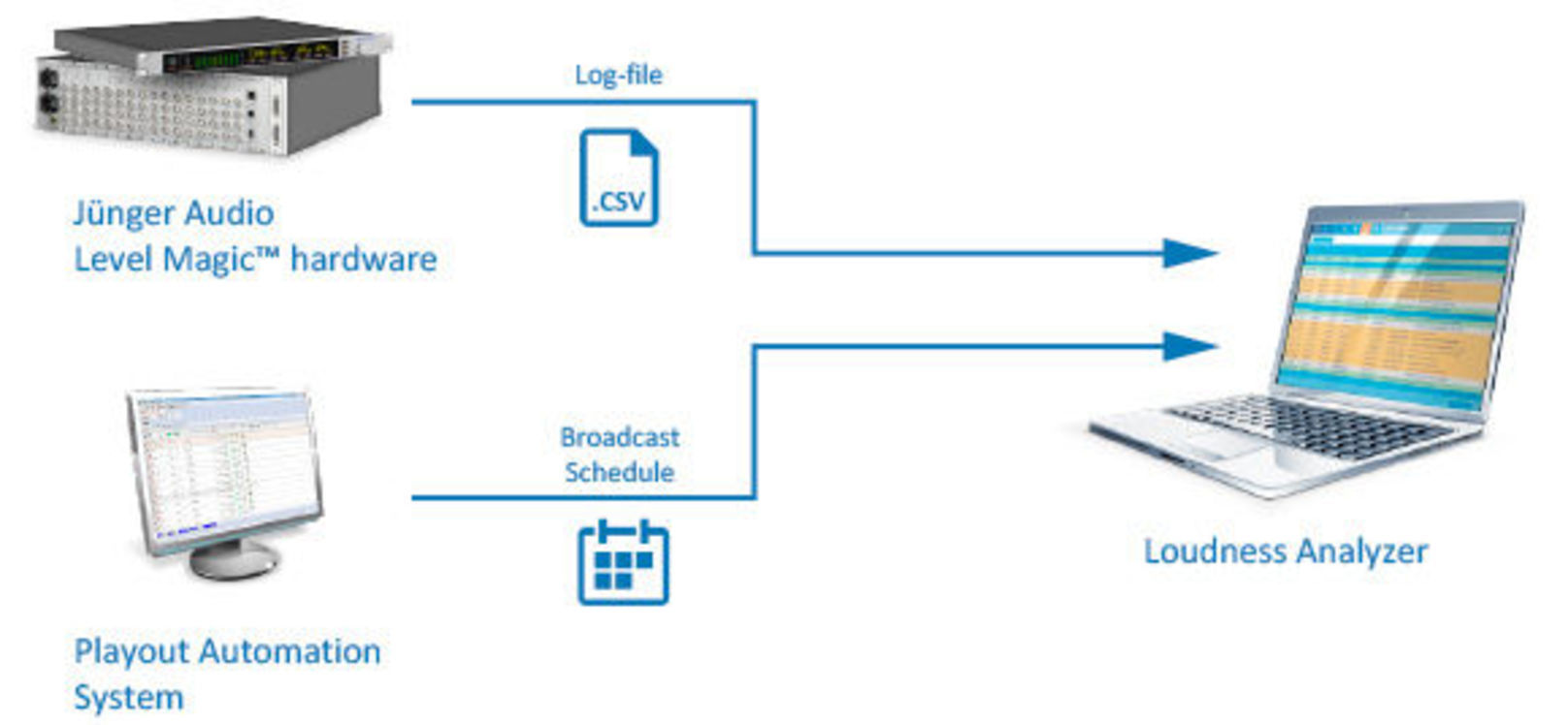 Jünger Audio Level Magic™ hardware solutions measure the short term loudness and true peak input and output values. Loudness Analyzer reads log-files and calculates integrated loudness for program blocks, advertisements and announces using the broadcast schedule.