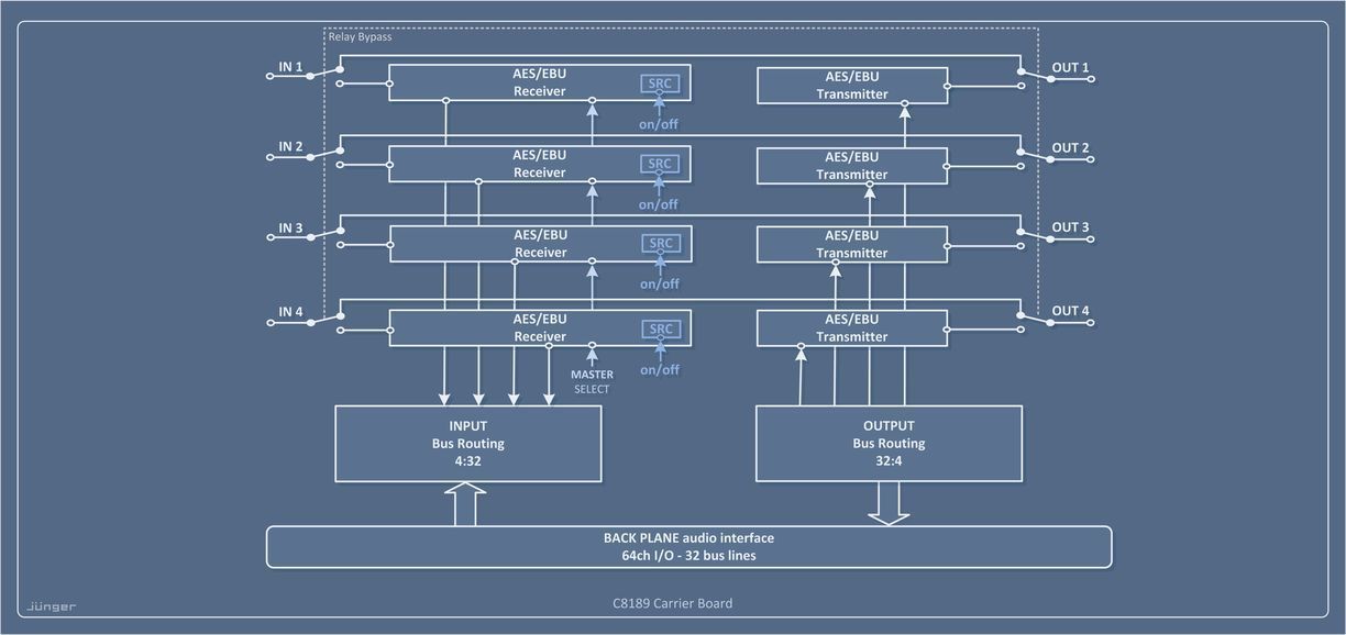 The C8189 is an I/O module designed for the C8000 modular processing solution providing 4x AES EBU (8ch) I/O with Sample Rate Converters (SRC) on BNC connectors.