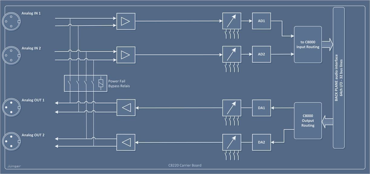 The C8220 is an I/O module designed for the C8000 modular processing solution providing 2 analog inputs and 2 analog outputs on XLR connectors.