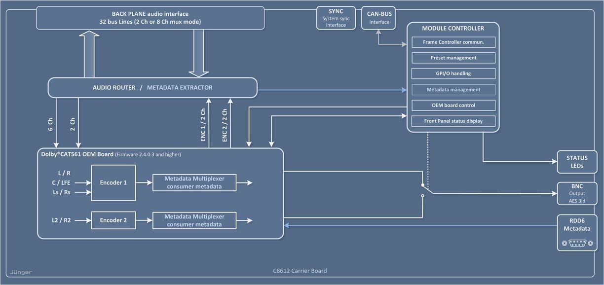 One of its most interesting features is the possibility to use the metadata coming with the audio input in one combined stream from upstream devices in the C8000 system (De-embedders, decoders, audio processors). This way, there is no external Metadata path necessary.