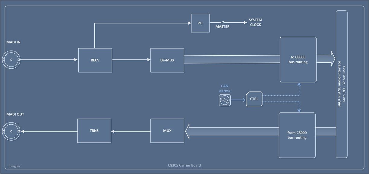 The MADI I/O is a perfect multichannel audio link to integrate C8000 modular processing with 3rd party audio systems such as routing systems to make individual processing features provided by processing modules available to such systems.