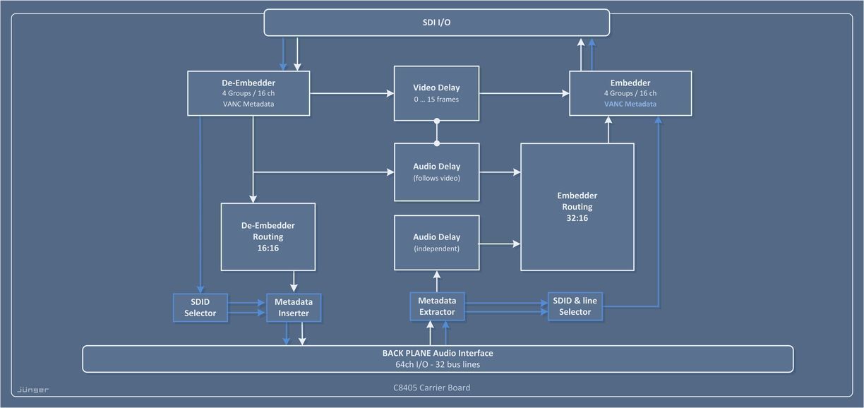 The C8405 is a 16ch HD/SDI de-embedder and embedder + Video Delay. It is designed to handle 3G channels carrying up to 16 channels of audio tracks (4 groups).