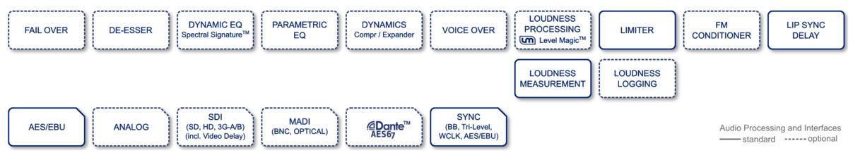 - Optional Level Magic loudness management (optional) according to: ITU-R BS.1770 (all revisions), EBU R128, ATSC A/85, ARIB TR-B32, Free TV OP-59 and Portaria 354