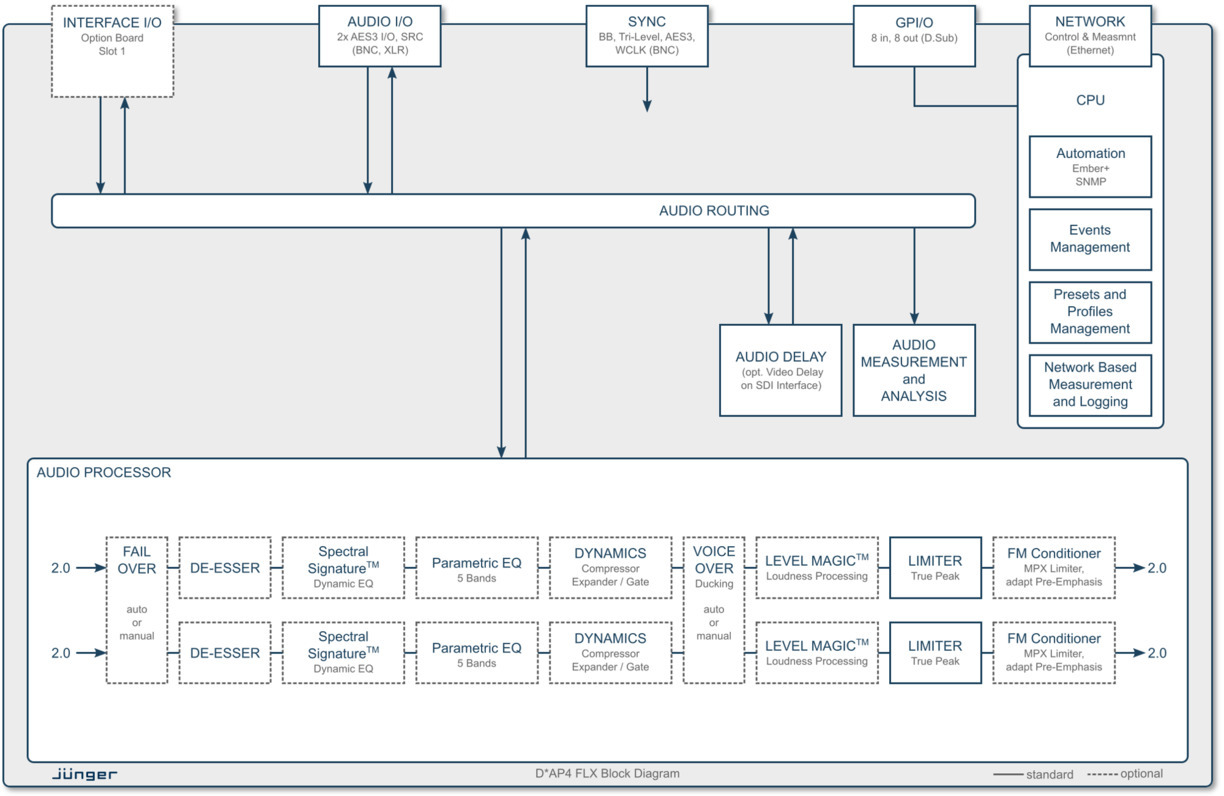 All system parameters are remotely accessible allowing the unit to be integrated and remotely operated by external control systems. An advanced built-in Event Management tool allows the remote loading of parameter presets either by hotkeys on the optional X*AP RM1 remote panel, by 8 onboard GPI/O’s or by network commands using the Ember+ control protocol. This helps users to apply individual processing to their programs or content and thereby ensure maximum audio performance in all situations.